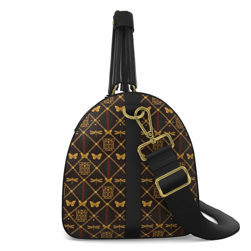 The rich chocolate-toned base showcases a sophisticated butterfly × dragonfly pattern layered with the Teddy Blaze Helix, finished with a striking gold For Love Crest that symbolizes strength, culture, and elevated street luxury. Smooth leather handles and polished hardware complete a timeless silhouette designed for travel, weekends, or everyday movement.
