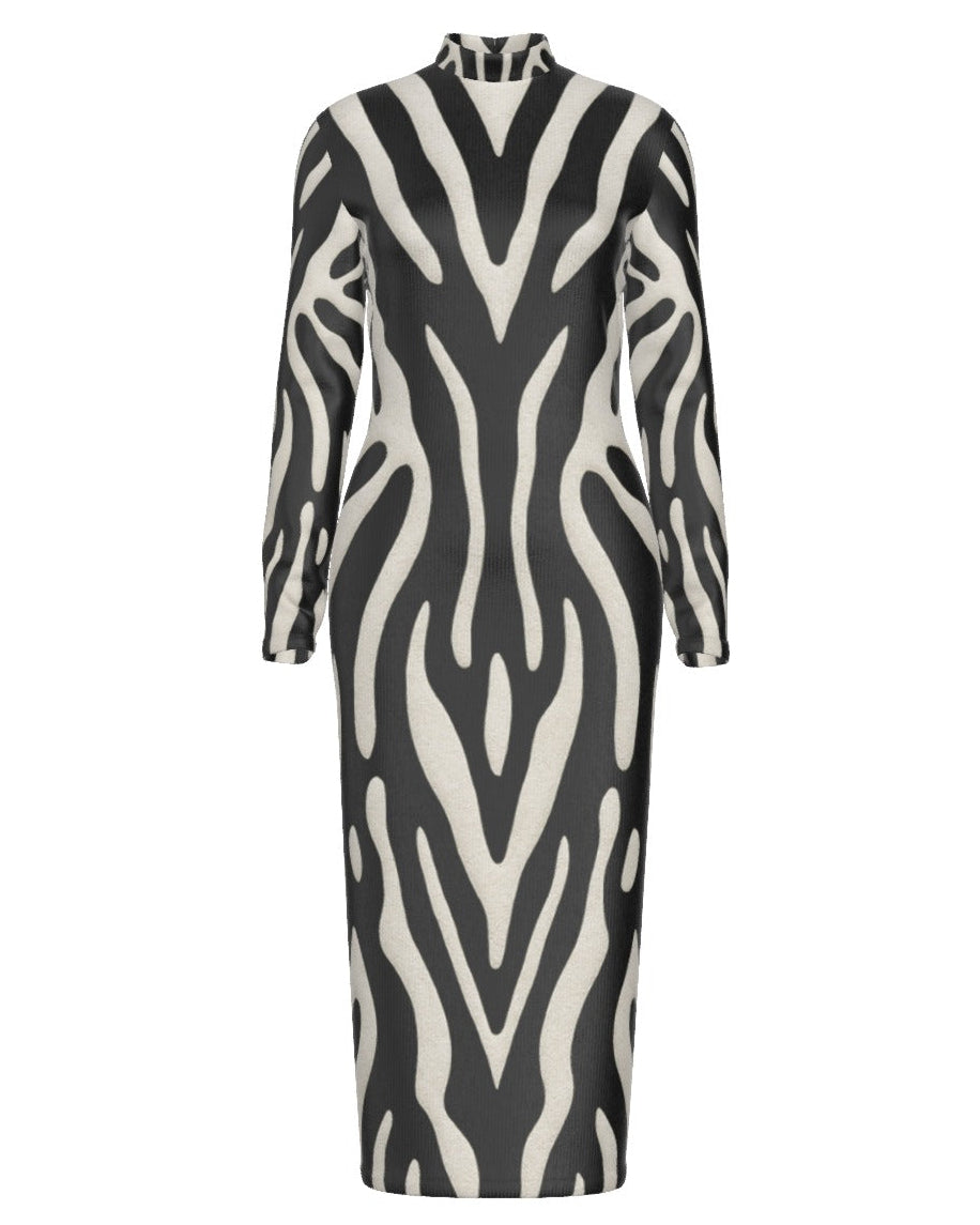 Animal Print Stand Collar Long Sleeve Midi Dress (ANI01)