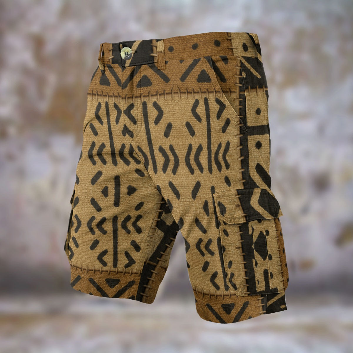 The Desert Rebel Mud Cargo Shorts reinterpret traditional mudcloth symbolism through the lens of modern luxury streetwear. Deep black tribal markings sit against warm desert tones, creating a look that feels both ancestral and futuristic.
