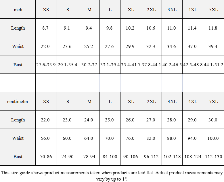 This size guide shows product measurements taken when products are laid flat. Actual product measurements may vary by up to 1".