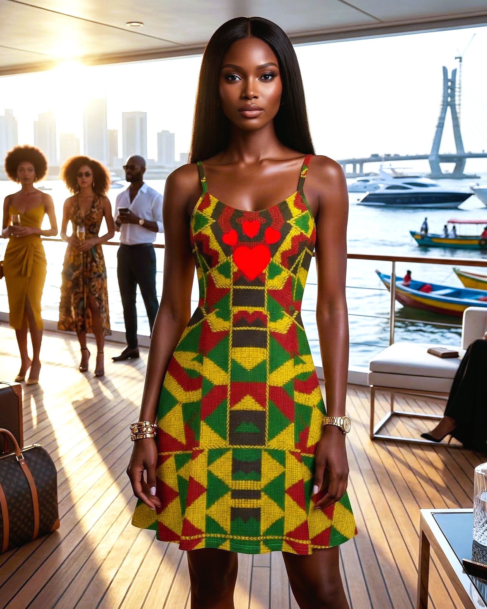 Designed with adjustable thin shoulder straps, the dress allows for a customizable fit while maintaining a clean, elegant profile. The vibrant Kente-inspired pattern delivers visual power, while the bold For Love Crest at the chest anchors the design with unmistakable Teddy Blaze identity.