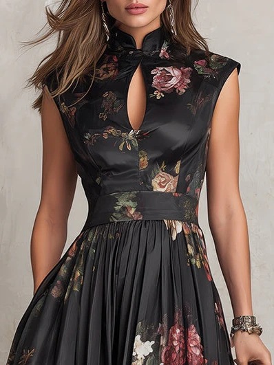 The Nightshade Floral Mandarin Maxi is a high-drama centerpiece of the "Private Lady" collection, blending traditional structural elements with a modern streetwear edge. This sleeveless masterpiece features a sophisticated mandarin-style collar with a teardrop keyhole cutout, leading into a cinched high-waisted bodice that defines the silhouette. The stretch polyester fabric is draped into an expansive, irregular skirt that flows with every movement, adorned with a moody, large-scale floral print that blooms against an obsidian black background.