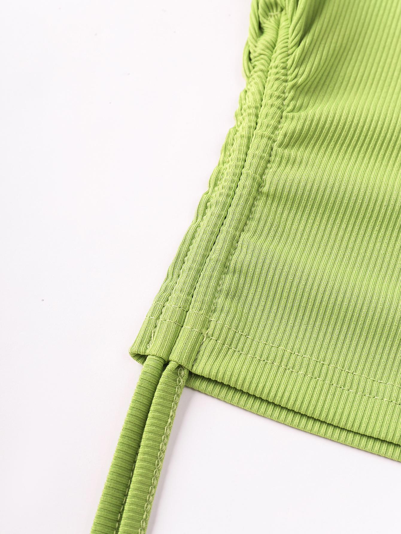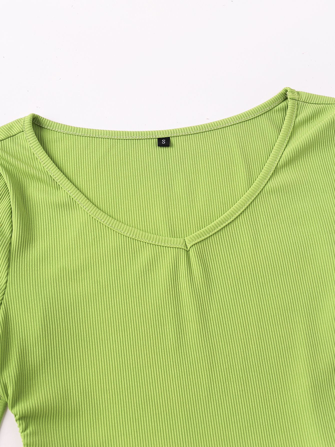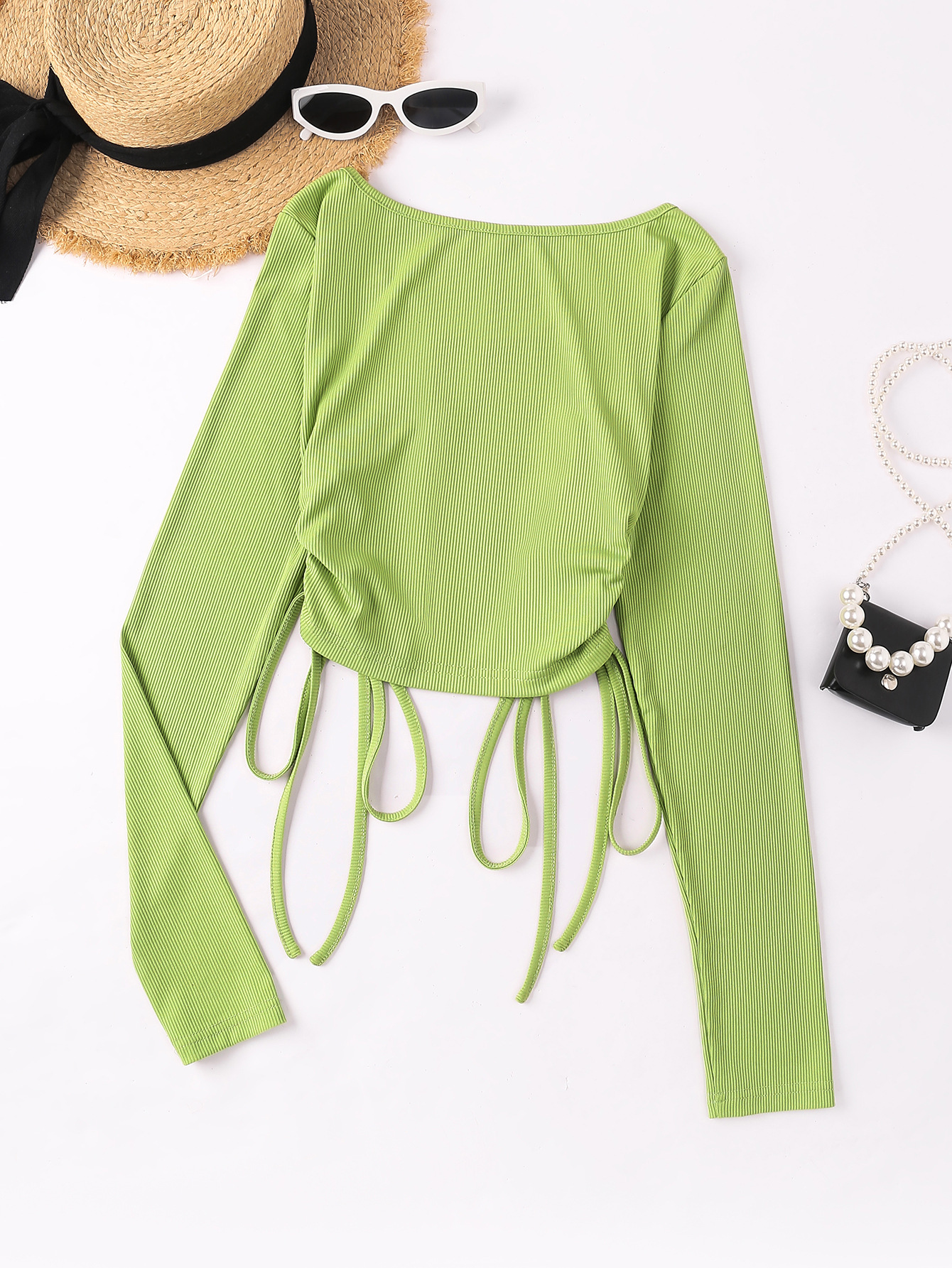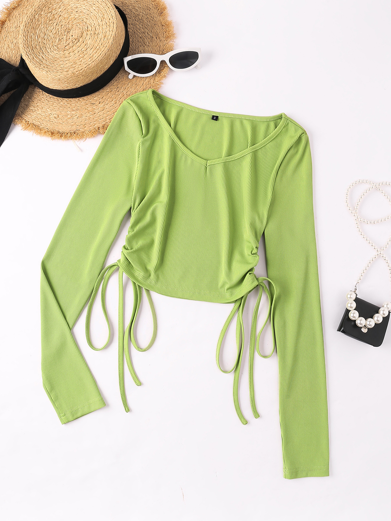 Ribbed Knit V-Neck Long Sleeve Drawstring Pullover Top