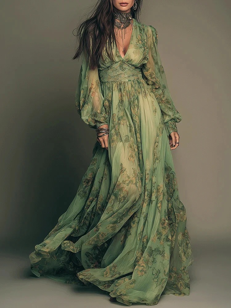 The Sage Urban Enchantment Maxi is a breathtaking fusion of ethereal romanticism and Teddy Blaze "Metropolis" grit. This long-sleeved gown features a deep V-neckline and gathered splicing details that define the fitted bodice before flowing into a voluminous, floor-sweeping skirt. The sage-green stretch polyester is adorned with a moody, vintage-inspired floral print, creating a look that is both grounded and otherworldly. Designed for the modern "Private Lady" on an urban commute, it offers a dramatic silhouette that commands attention from the sidewalk to the gallery.