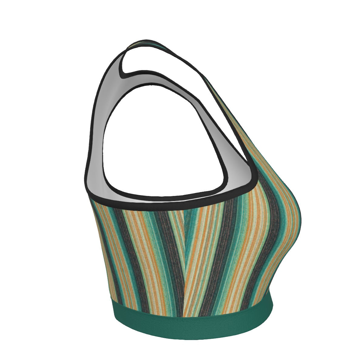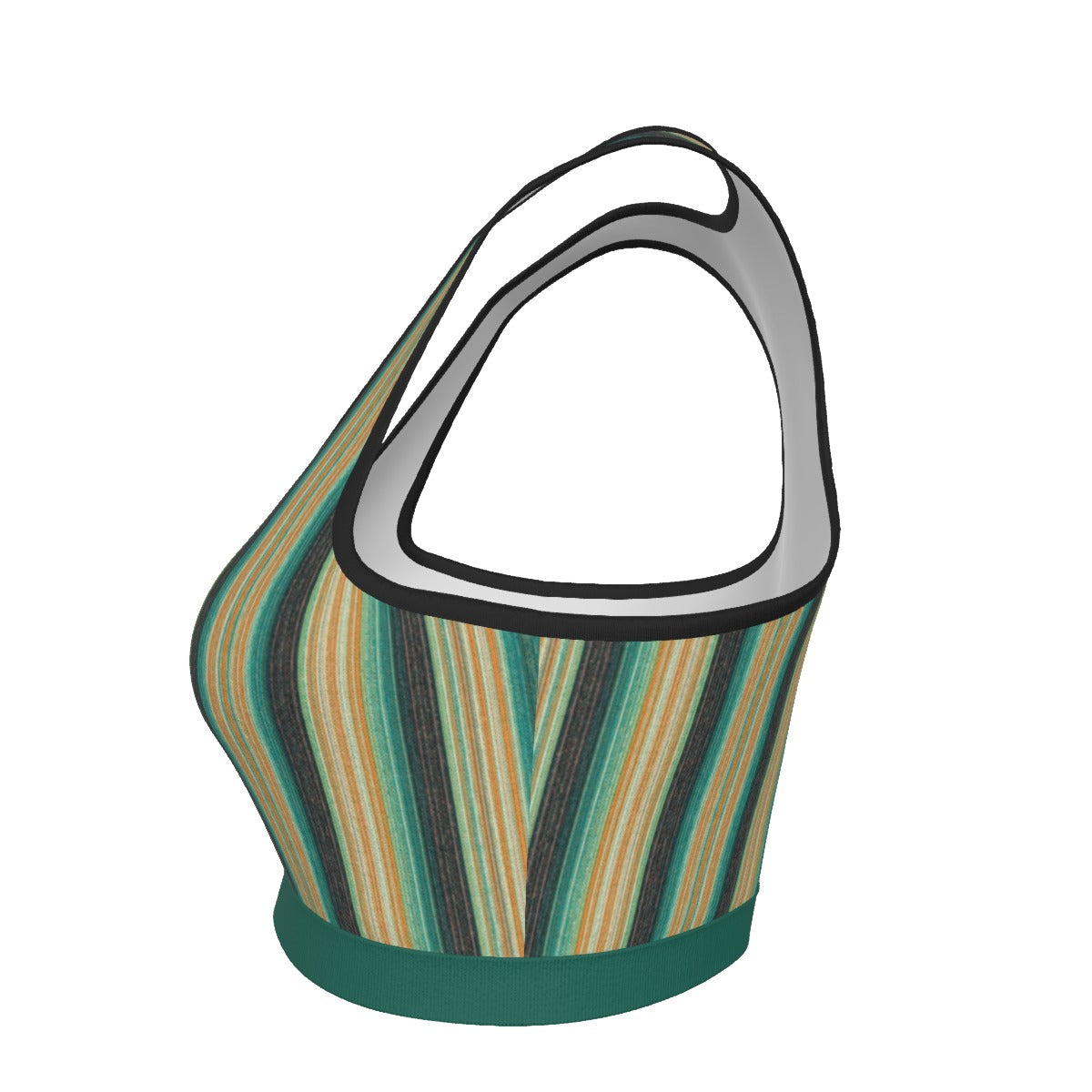 The Sierra Verde Ridge Racer Sports Bra channels the vibrant greens and sandstone tones of the Sierra Nevada into a performance-ready silhouette. Flowing vertical stripes in jade, evergreen, sandstone, and canyon clay mirror the layered ridgelines and alpine valleys that define the Sierra Verde landscape.