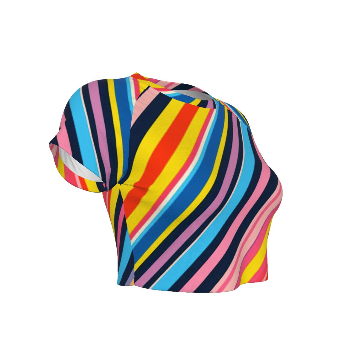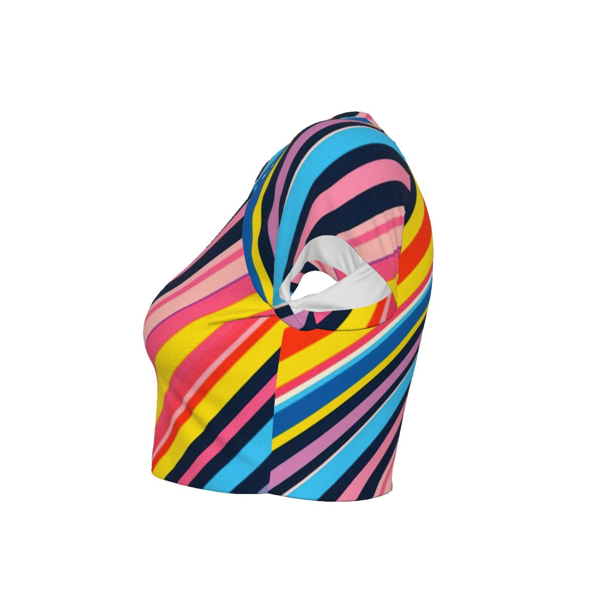 The Salsa Fuego Stripe Crop Tee turns motion into fashion with sweeping diagonal stripes that feel like music moving across the body. Vibrant bands of yellow, pink, turquoise, navy, and red swirl together in a bold pattern that radiates confidence and cultural heat.
