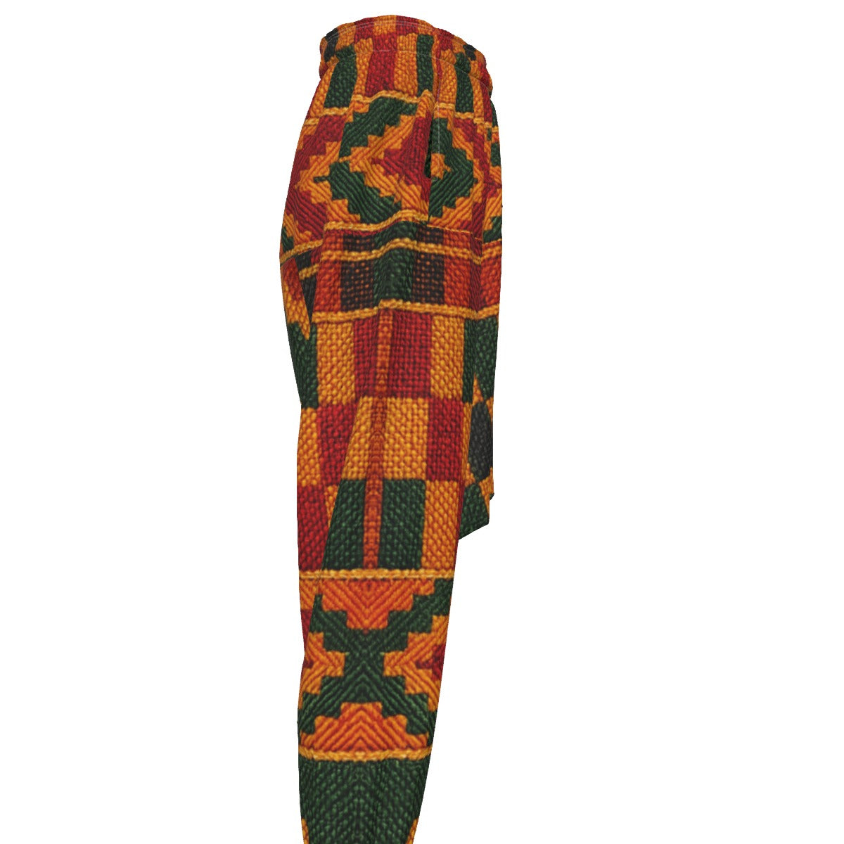 Inspired by the iconic Kente patterns of West Africa, these relaxed-fit trousers bring bold geometric color and cultural storytelling into the Teddy Blaze universe. The flowing silhouette and loose harem cut create a comfortable, expressive fit designed for warm climates, beach settings, and resort living.